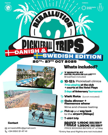 Pickleball i sydens sol☀️. En uges pickleball ferie i charmernede Cadiz med udgangspunkt i et af Europas bedste pickleball miljøer💥 Pickleshoppen har indgået et samarbejde med Pickleball Rota og vi er nu klar til den første fælles skandinaviske pickleballrejse. Er der spørgsmål rettes de til Ernesto fra Pickleball Rota: ernesto88v@gmail.com. Vi hjælper også med individuelle rejseønsker, så tag endelig fat I os hvis vi skal skræddersy en tur til jer. Vamos pickleball! -----------------------------------------------------------------------------------------------------------------------------------------------------------------------------------------------------------------------------------------------------------------------------------------------Pickleball i söderns sol☀️. En veckas pickleballsemester i charmiga Cadiz med utgångspunkt i en av Europas bästa pickleballmiljöer💥. Pickleshoppen har inlett ett samarbete med Pickleball Rota och vi kan nu presentera den första gemensamma skandinaviska pickleballresan. Vid frågor så kontakta Ernesto från Pickleball Rota: ernesto88v@gmail.com. Vi hjälper också till med individuella reseönskemål så kontakta oss på Pickleshoppen så skräddarsyr vi en resa till er. Vamos pickleball!